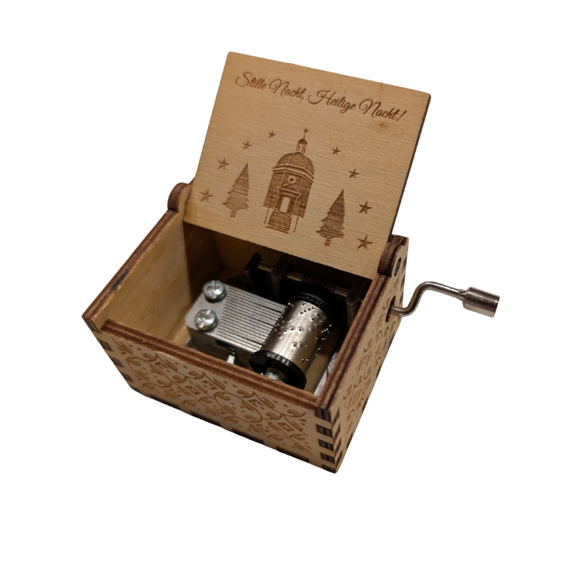 - Persönliche Note: Im Inneren des Deckels befindet sich die Gravur des Liedtitels sowie das Motiv der Stille Nacht Kapelle mit Tannenbäumen, das sofort festliche Stimmung verbreitet.
