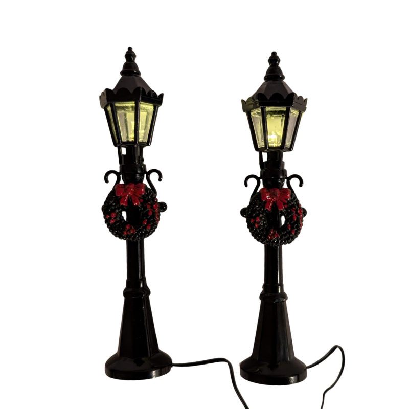 Verleihen Sie Ihrer Miniatur-Weihnachtslandschaft, Ihrem Fensterbrett oder Ihrem festlichen Tisch einen nostalgischen und bezaubernden Glanz mit diesen dekorativen Laternen. Dieses Paar klassischer Straßenlaternen, geschmückt mit festlichen Kränzen, erzeugt eine warme, einladende Atmosphäre, die an die besinnliche Weihnachtszeit erinnert.